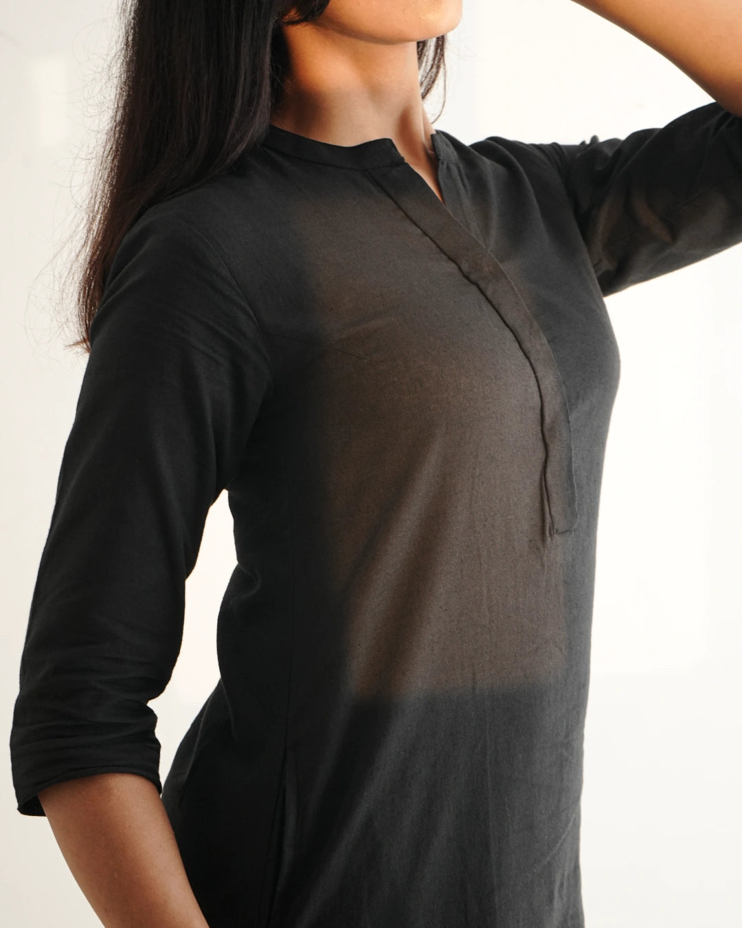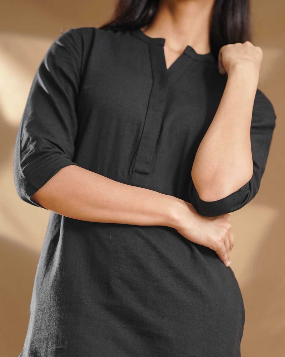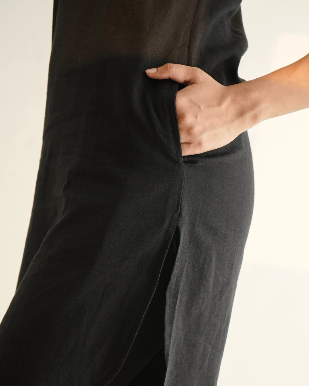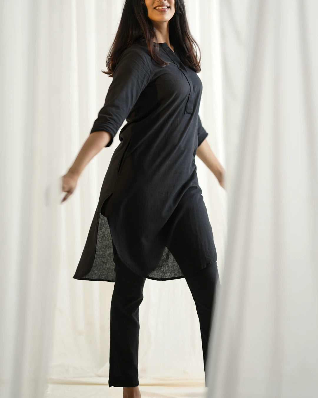 Description: A classic kurta set that goes beyond basics, cut from soft cotton linen with just the right amount of structure. Clean lines, a rounded hem, and a polished collar keep it looking sharp, while the airy fabric makes it a go-to for everything from errands to office days.