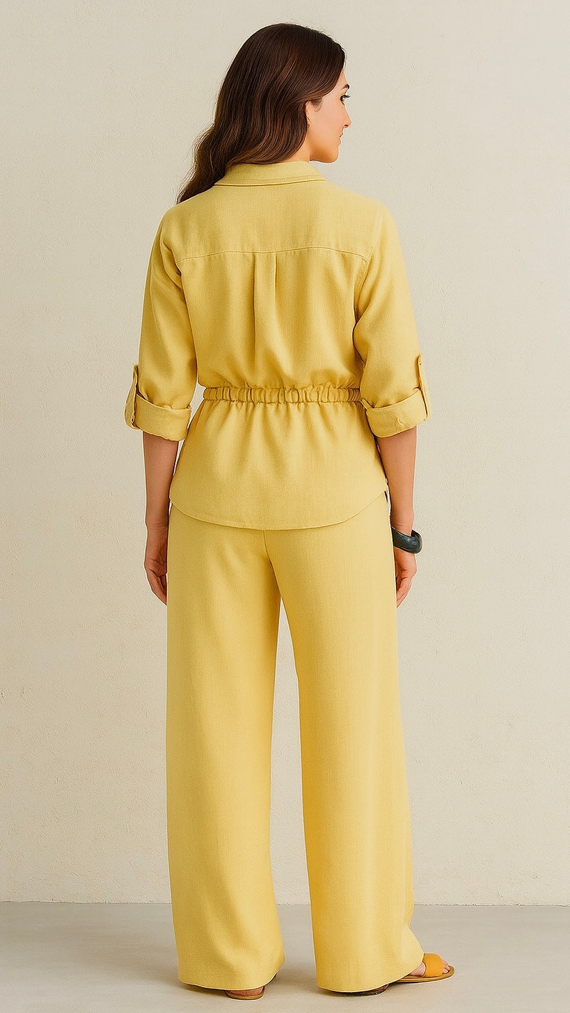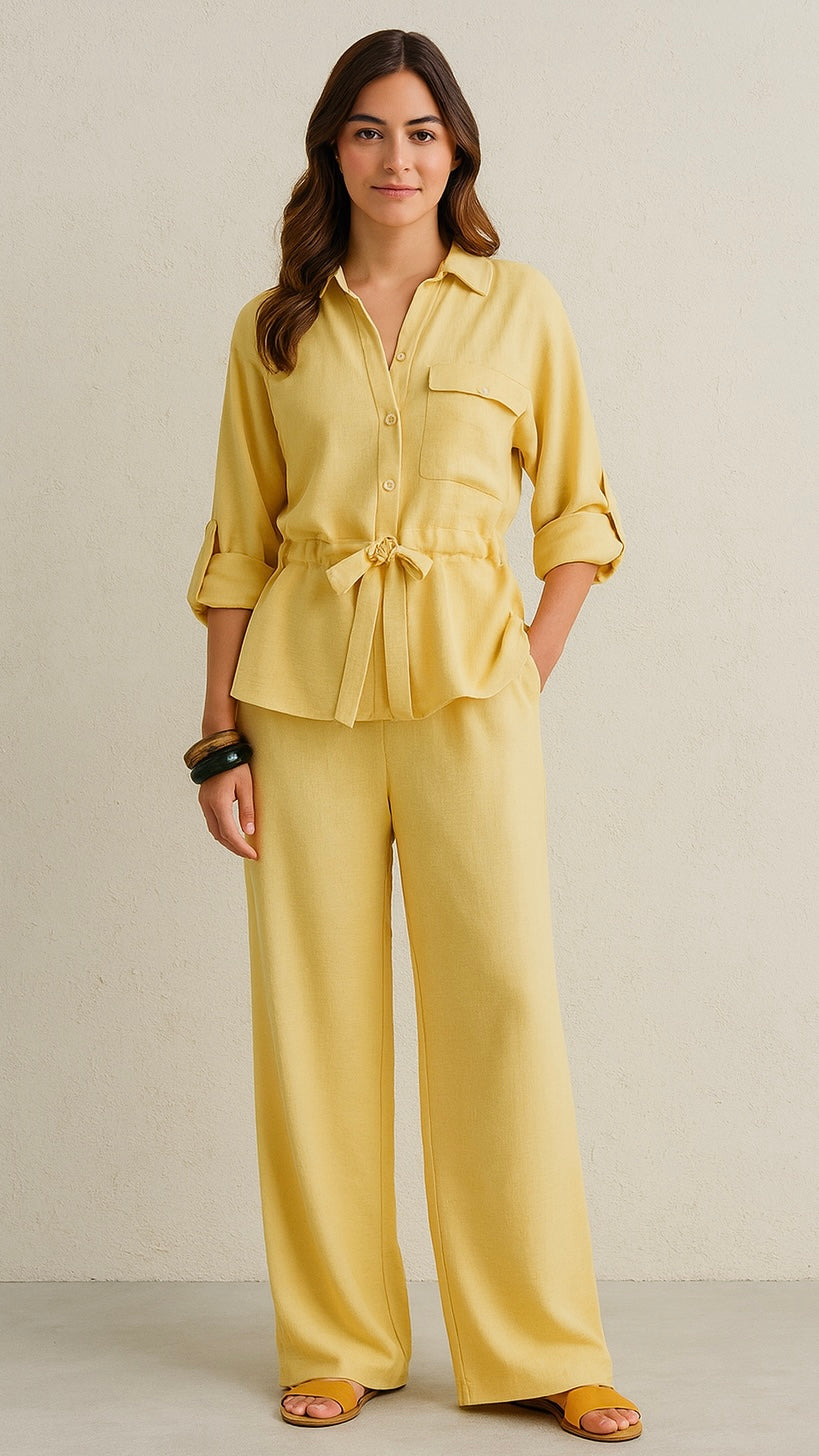 The shirt features a drawstring waist tie that beautifully cinches your silhouette, along with rolled-up sleeves and a relaxed fit for an easygoing yet polished vibe. Paired with wide-leg pants, it gives a flattering fall and freedom of movement that’s perfect for workdays, brunches, or casual outings.