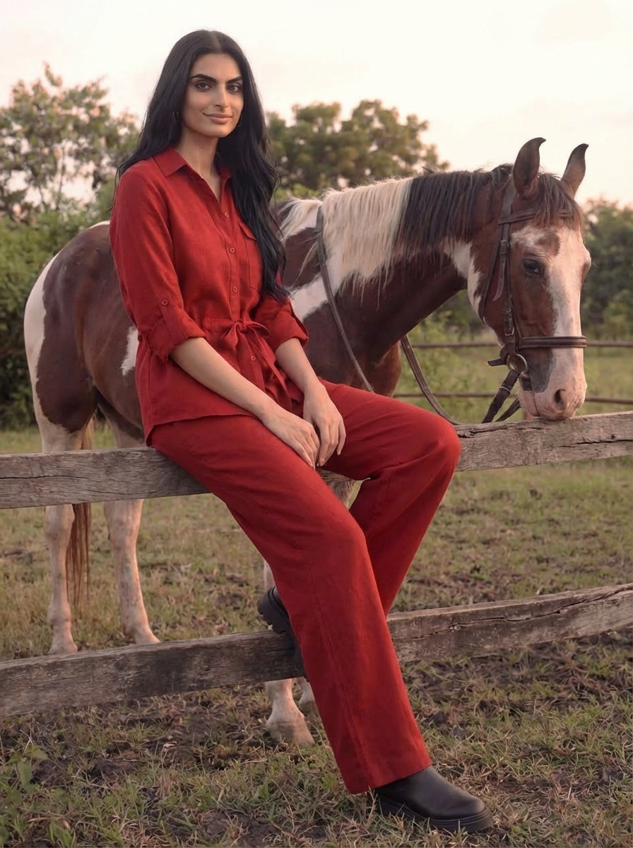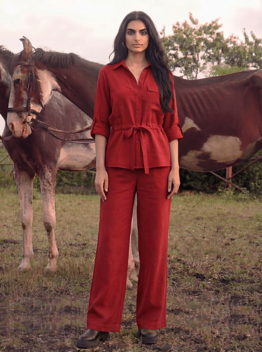 The shirt features a drawstring waist tie that beautifully cinches your silhouette, along with rolled-up sleeves and a relaxed fit for an easygoing yet polished vibe. Paired with wide-leg pants, it gives a flattering fall and freedom of movement that’s perfect for workdays, brunches, or casual outings.