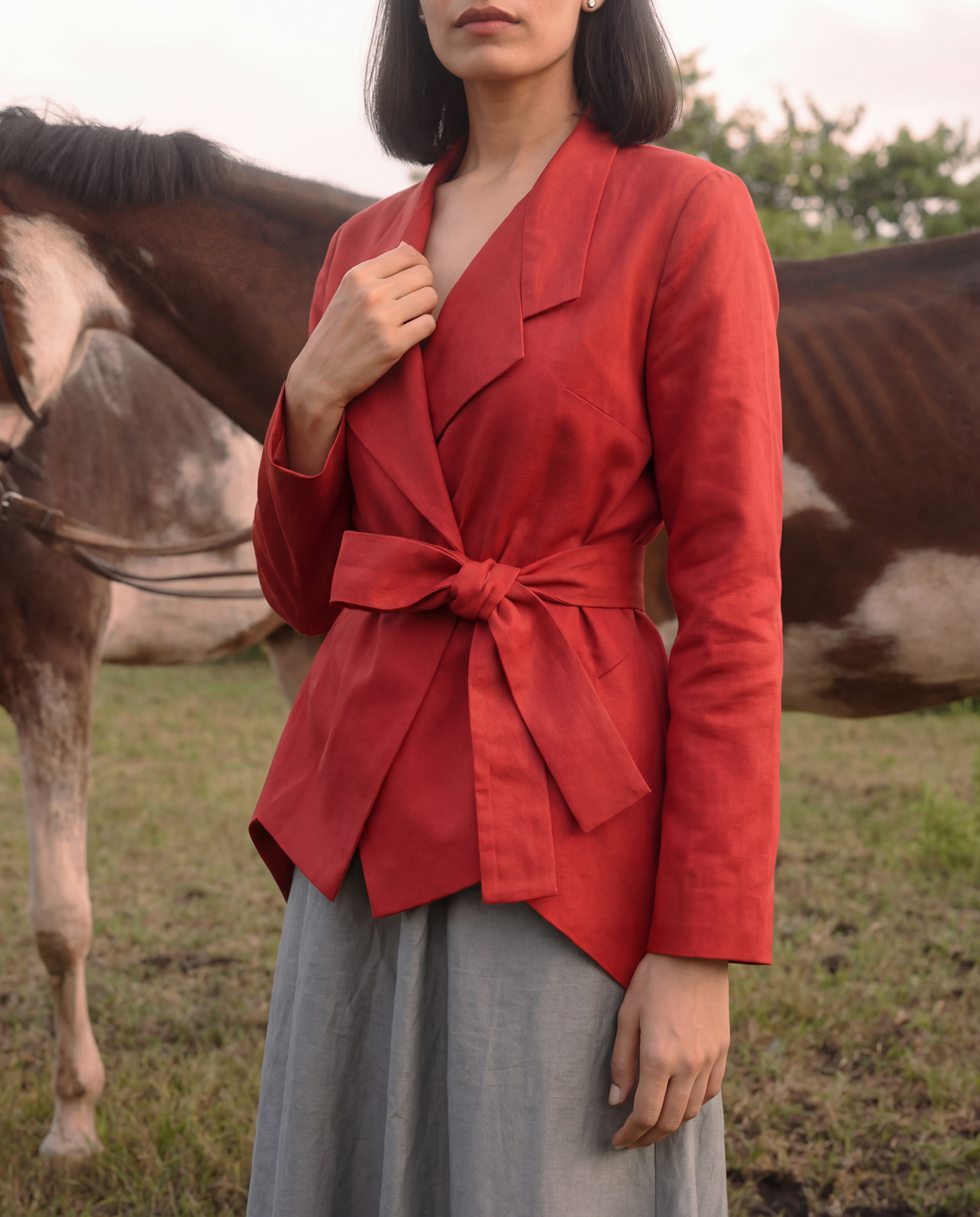 The Scarlet Red Blazer Wrap Blazer Shirt, designed to give you a sharp, tailored look with the comfort of breathable daywear. Crafted in a premium cotton-linen blend, it feels lightweight, airy, and easy on the skin while still looking polished.