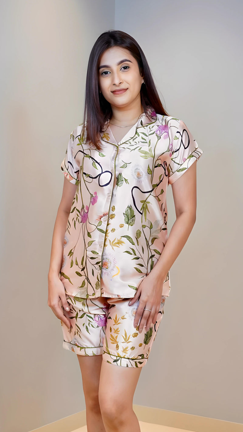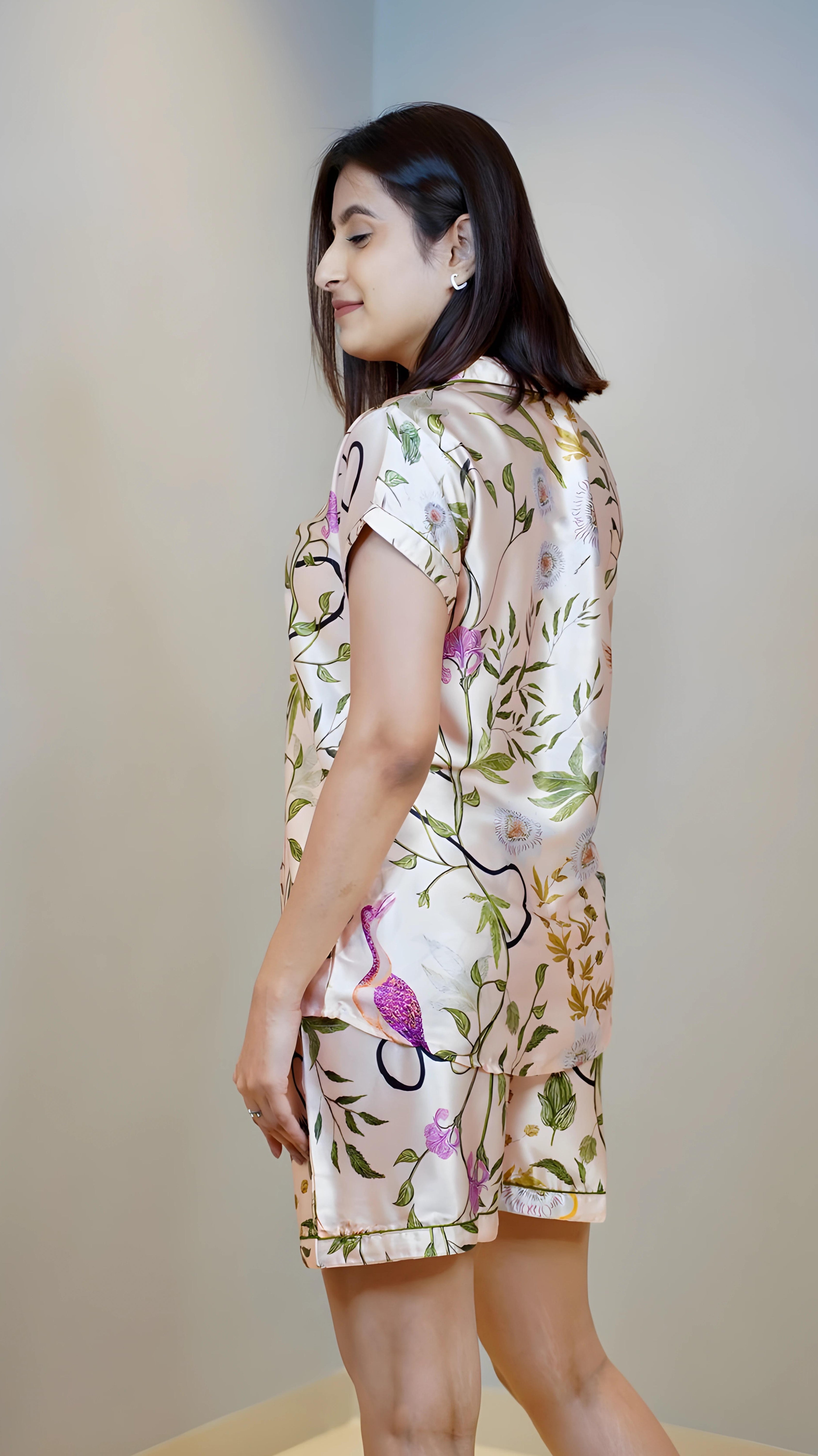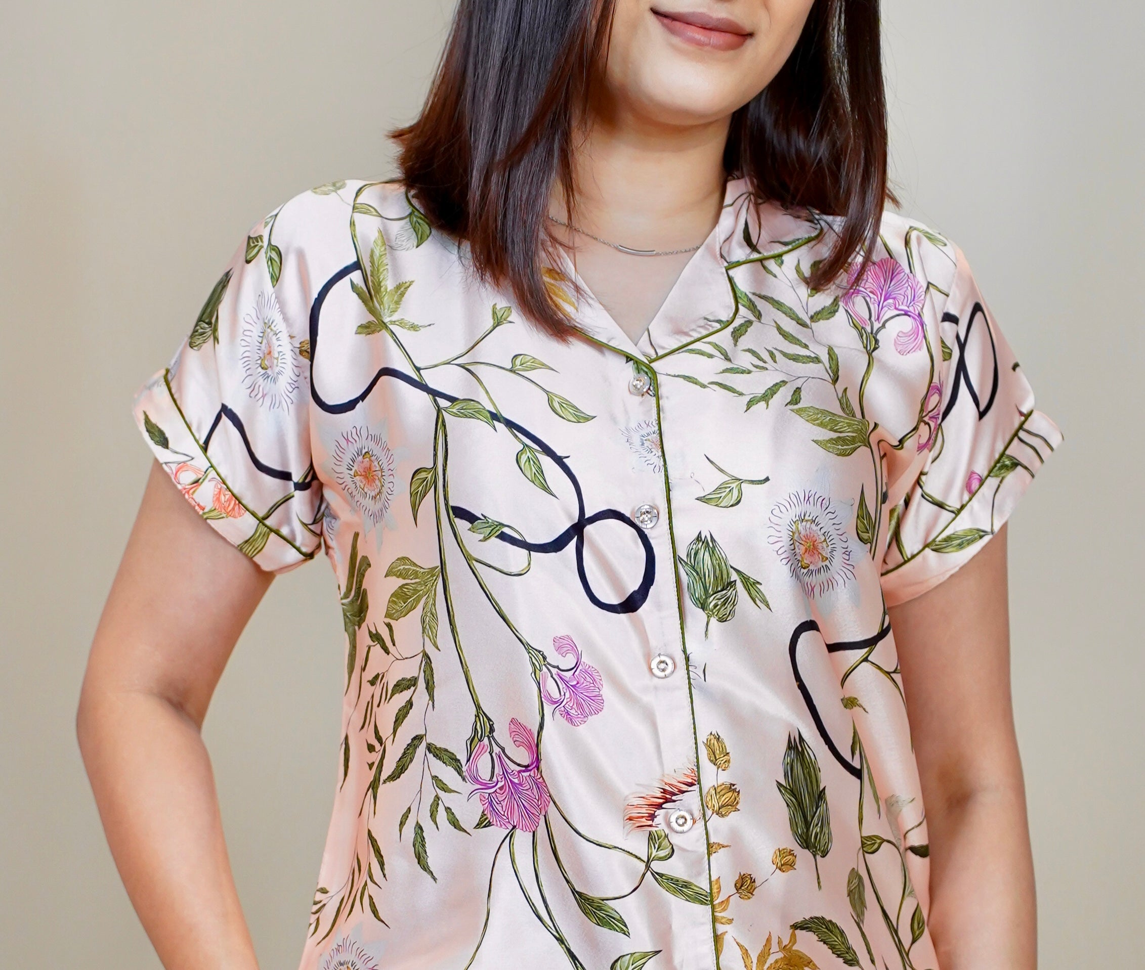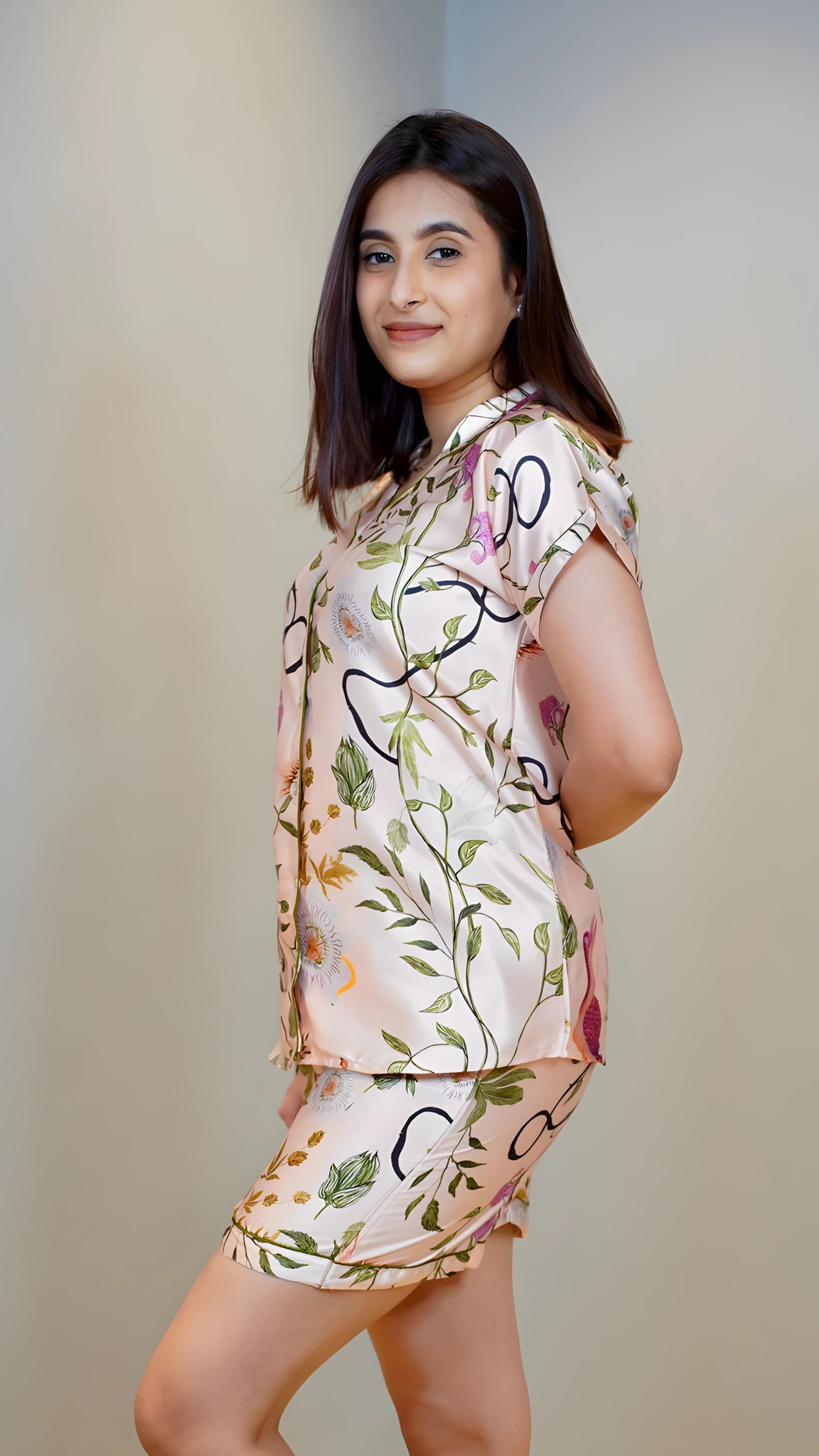 Immerse yourself in the ethereal charm of the Blossom Bliss Shorts PJ Set, where the beauty of diverse flowers unfolds on a backdrop of pastel pink within the Eternal Bliss Collection by Jynara.