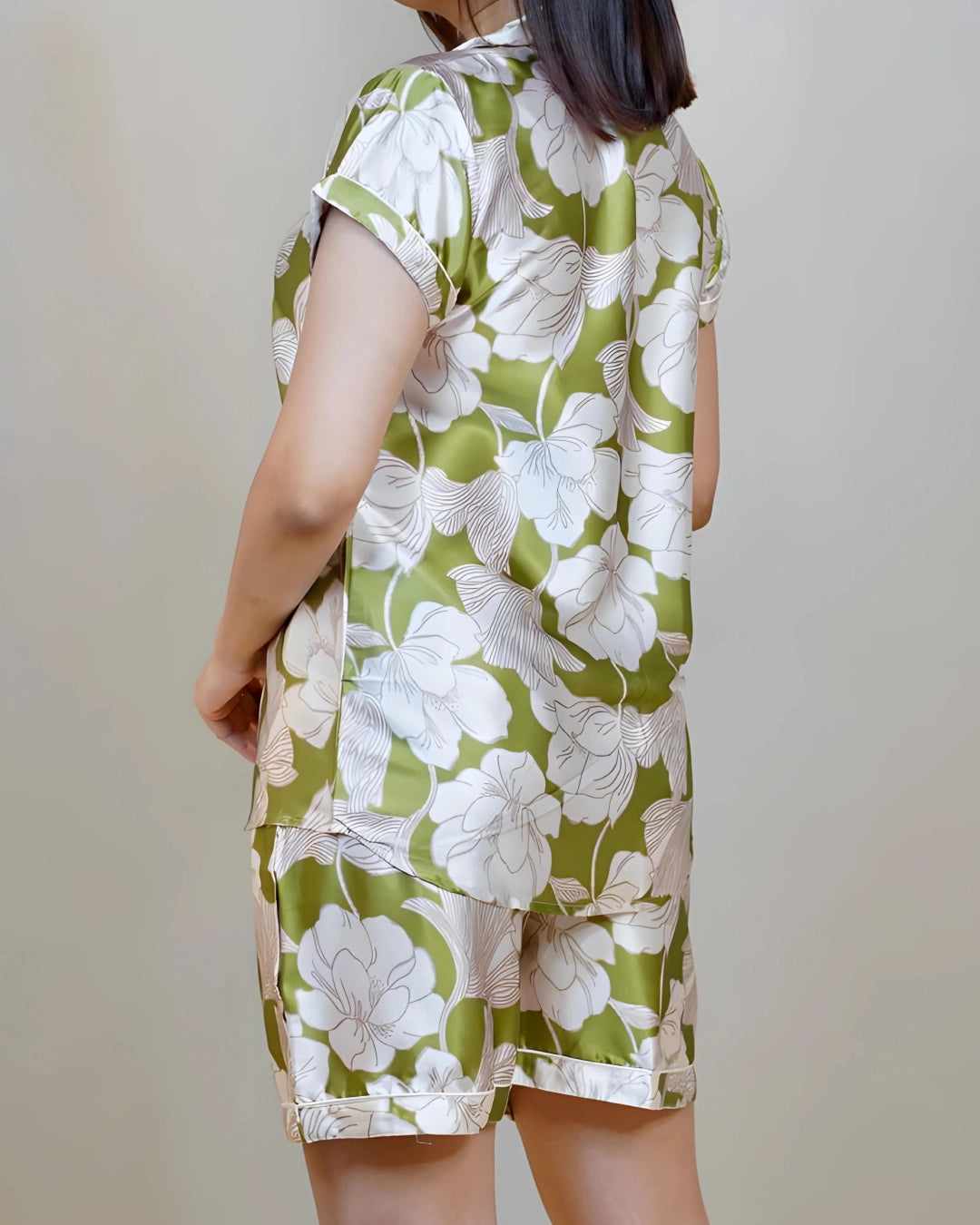 Jynara unveils the epitome of sophistication with the "Eternal Bliss Collection," presenting the Ethereal Florals Shorts PJ Set. Delicate cream-colored florals gracefully adorn the henna green fabric, creating a masterpiece of luxury loungewear.