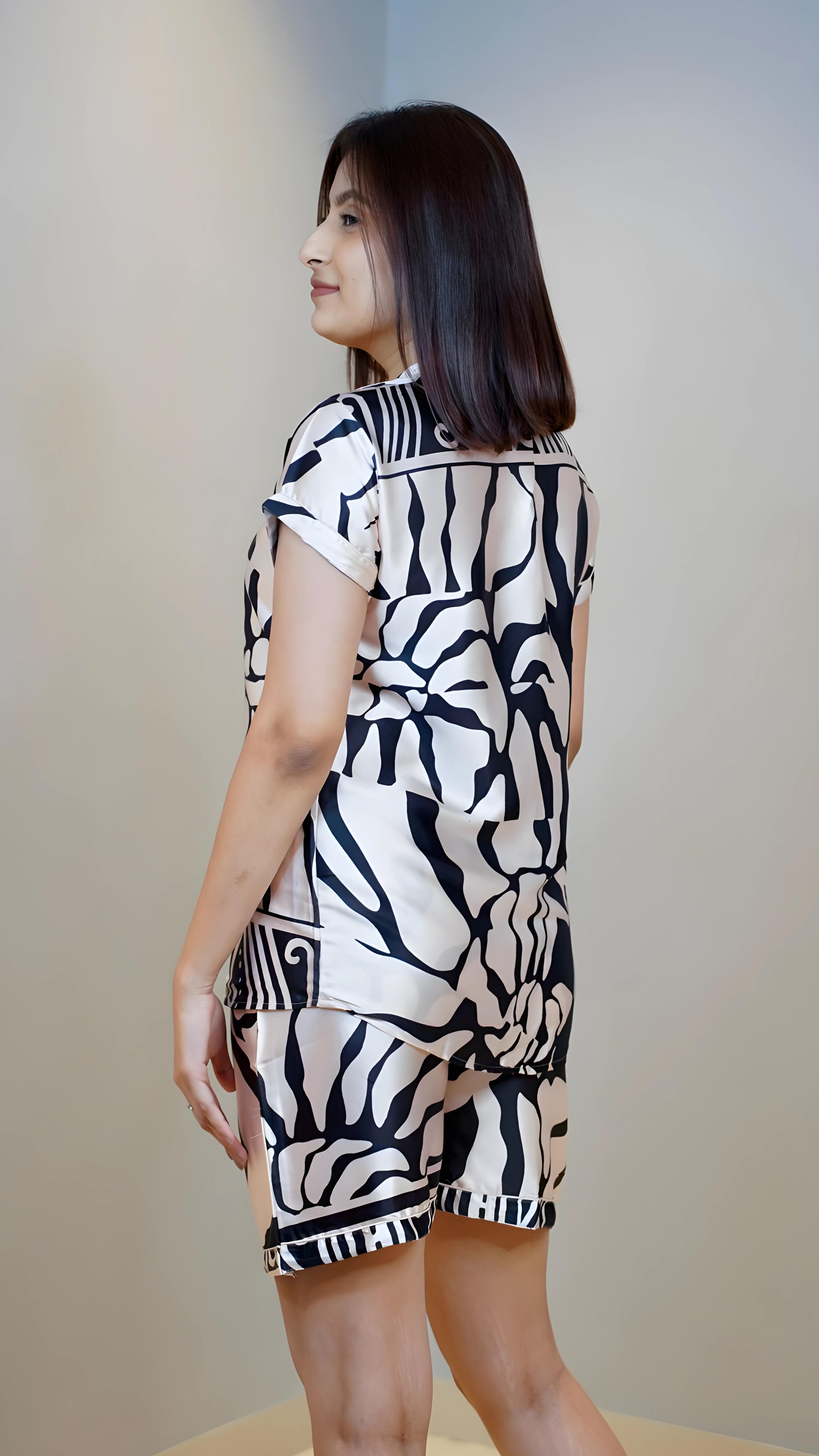 Jynara proudly presents the "Eternal Elegance Collection," unveiling the refined allure of the Fossil Harmony Shorts PJ Set. Immerse yourself in sophistication with the "Monochrome Fossil Symphony," where black and white unite to create a timeless canvas of elegance.