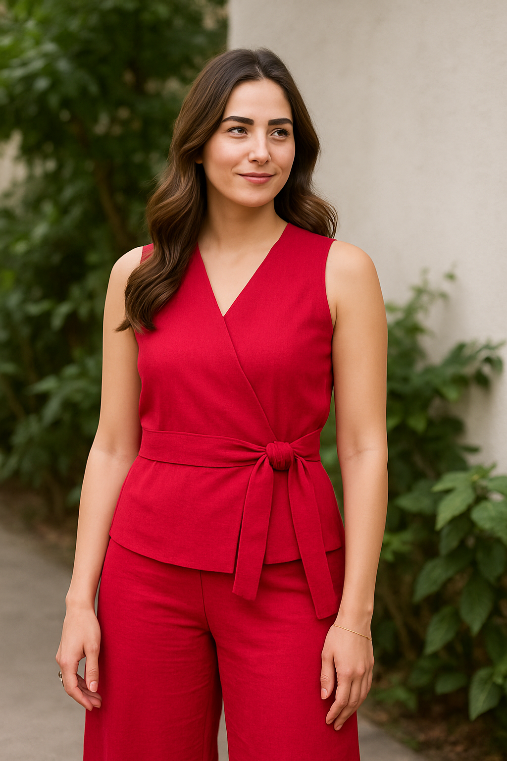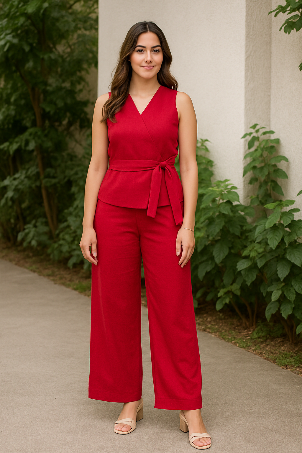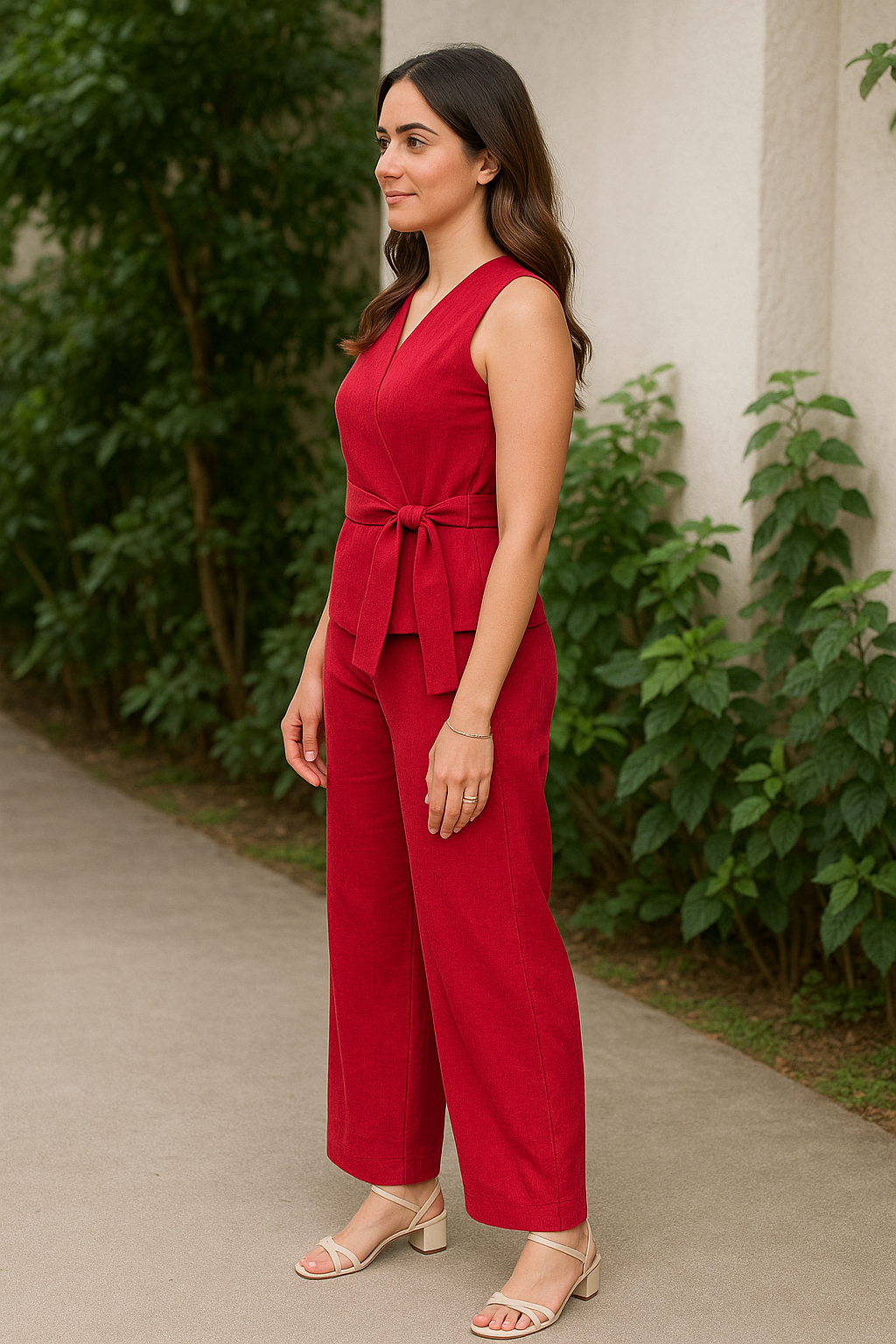 Crafted in a premium cotton-linen blend, this co-ord is breathable, lightweight, and perfect for all-day comfort. The sleeveless wrap-style top with a waist tie-up belt flatters your silhouette, while the wide-leg pants add a chic, relaxed vibe.